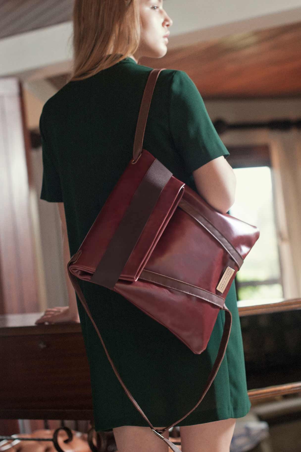 Backpack laptop in bordeaux/brown leather. deep dark brown leather. Brown elastic. Two inner pockets. Dimensions: 35×33 cm. Adjustable straps: 70cm – 80cm.With an extra handle strap. REF. MMVSBPB Made in Portugal